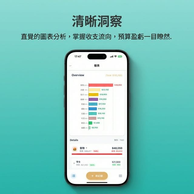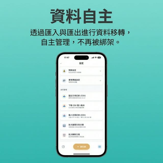 - 高度自主:從自訂分類、預算、標籤,到資料的匯入/匯出 (CSV),打造專屬於個人的記帳邏輯。