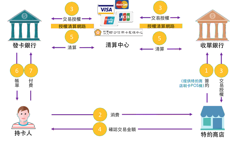 關於信用卡的原理與分佈,推薦直接參考「刷了卡,你的錢去了哪裡? — 剖析信用卡支付市場運作」一文的介紹,以下摘錄重點名詞和流程圖: