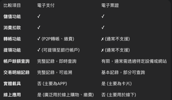 - 電子票證:例如悠遊卡、一卡通。先儲值後消費,主要用於小額支付,但通常無法轉帳。