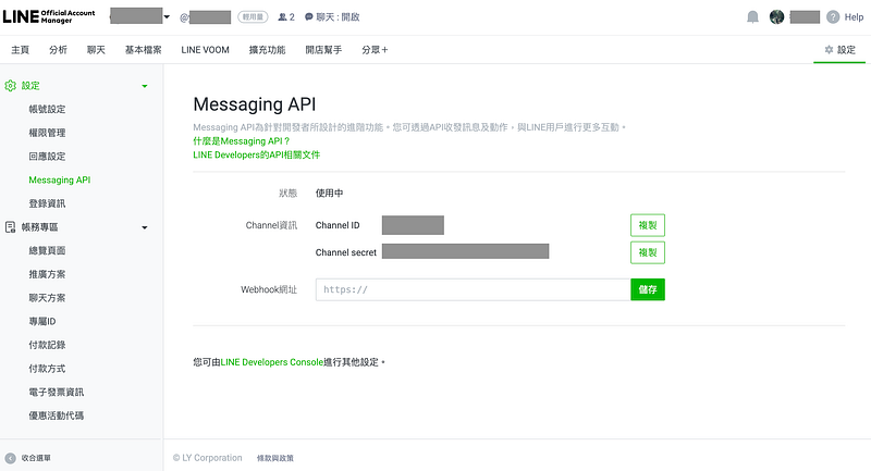 由於我之前已經有建立好免費的 (灰盾) LINE OA帳號了,啟用 Messaging API後,可以找到我的 LINE Developer 帳號完成連結,並取得 Channel ID 跟 Channel Secret,會自動存到 LINE Developer 的 Channels 設定當中。
